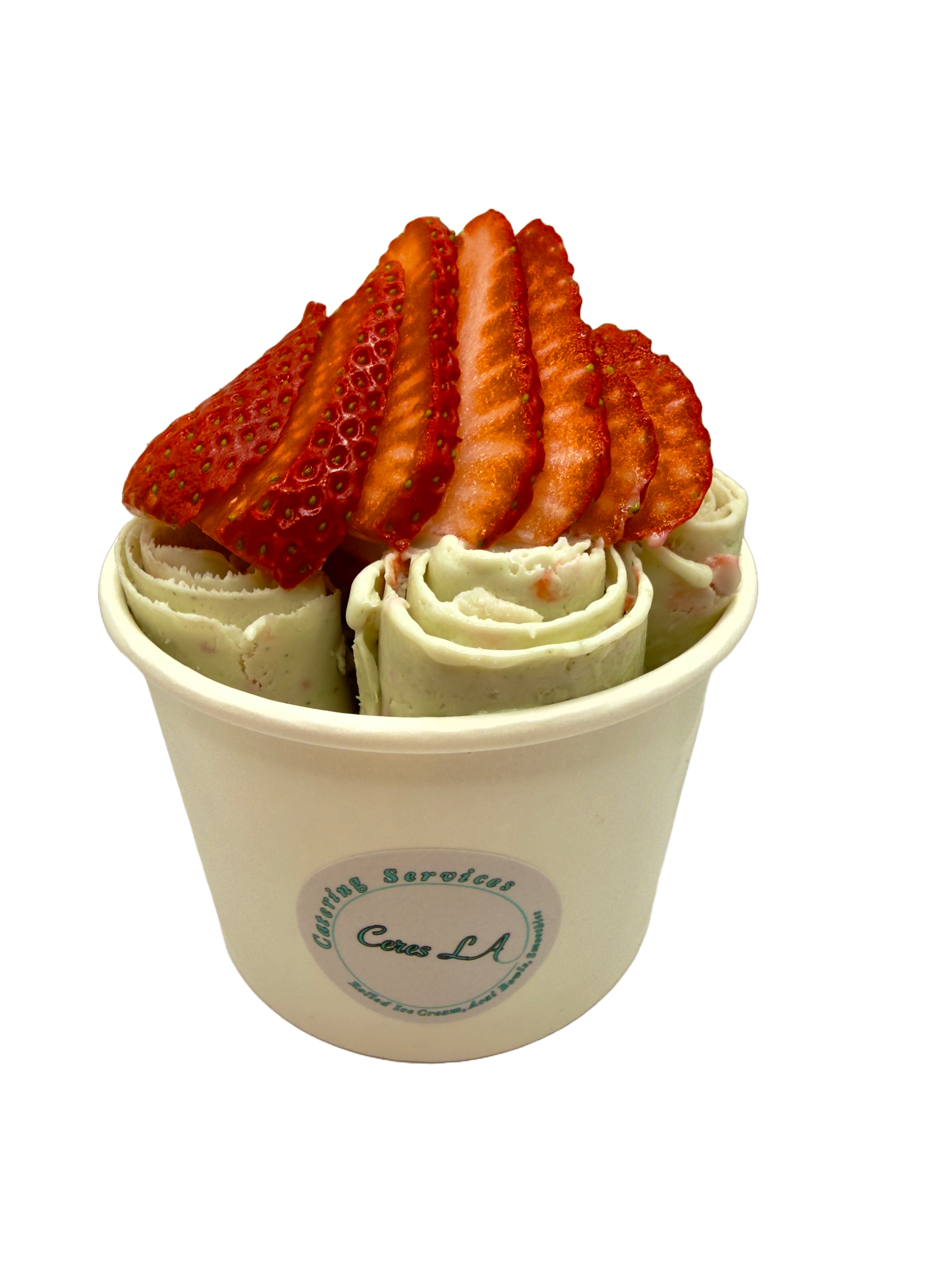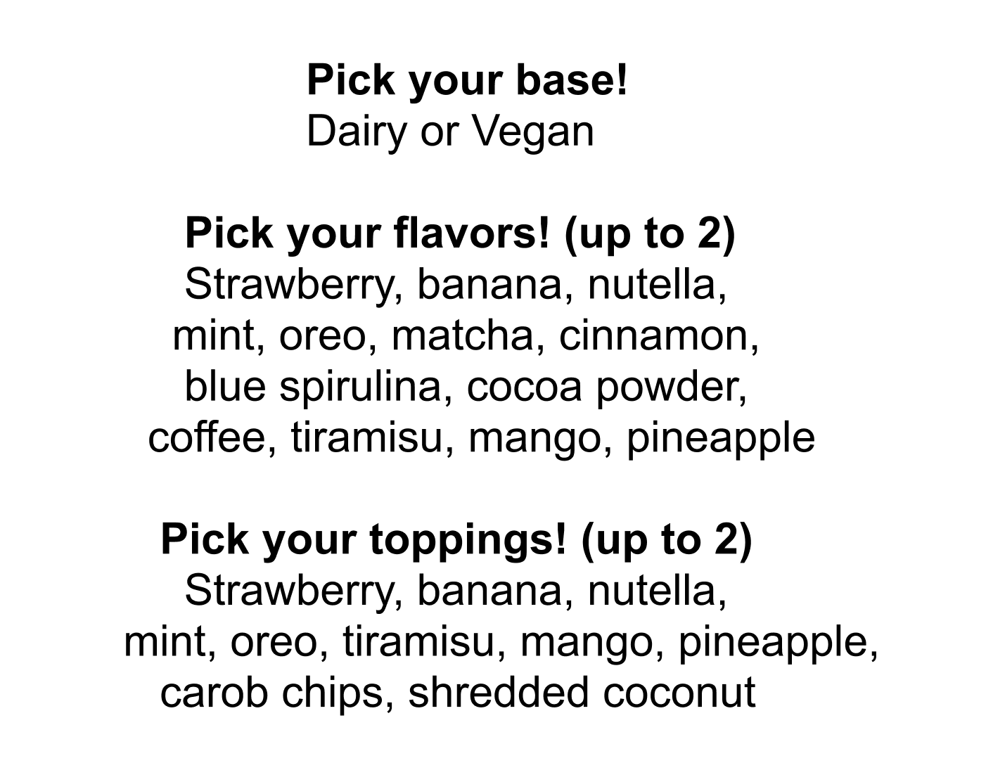 Customize your own rolled ice cream with your choice of 2 toppings and 2 bases.